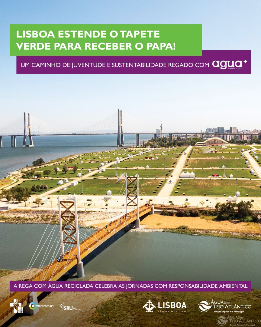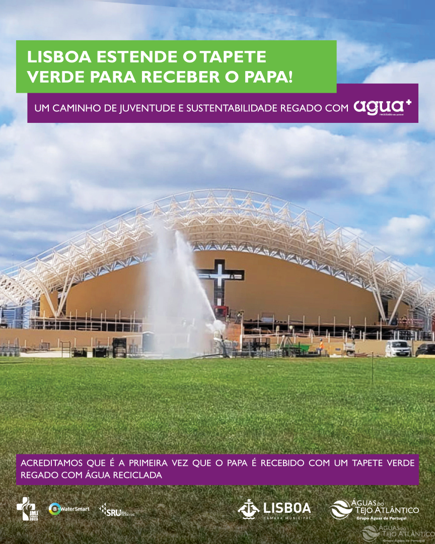 Mas vamos mais longe, Na Fábrica de Água de Beirolas estamos a produzir água reciclada (água+), com qualidade licenciada (água residual tratada para reutilização Classe A), para a rega do relvado em frente ao Altar-palco, conferindo à Camara Municipal de Lisboa a capacidade de apresentar um Tapete Verde sustentável nestas JMJ 2023.